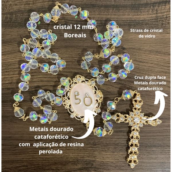 Terço Bodas de ouro em metais dourados cataforético com lugar para personalizar com foto ou logotipo do casal